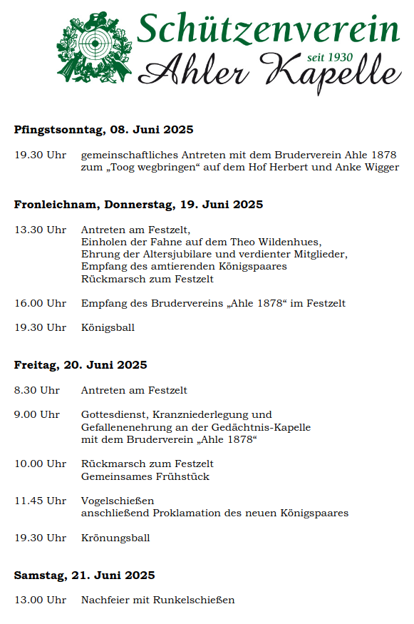 Am 05.10.2024 feiern wir zusammen mit der Landjugend unser Erntedankfest. Um 15:00 Uhr geht es mit der Messe in der Ahler Kapelle mit der Unterstützung von Pastor Alfons Homölle los. Anschließend gibt es Kaffe und Kuchen bei Hovestadt. Bei dem ein oder anderen Bier geht es dann in das Dämmerschoppen über.