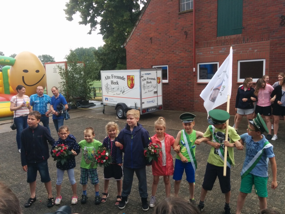 Unter der Vogelstange herrschte am Donnerstag (31.05 - Fronleichnam) reges Treiben, denn ca. 70 Kinder fanden sich auf dem Hof von Karin und Heinz Oergel ein und rangen um die Königswürde. Doch Timo Bröking war der glückliche der den Vogel von der Stange holte und er nahm sich Thea Schwietering zur Königin. Die beiden haben Simon Große-Vestert mit Margarete Eggenstein (Foto links) und Lutz Göcke mit Anna Schming (Foto rechts) zum Throngefolge ernannt. Neben dem Vogelschießen gab es für die Kleinen viele Attraktionen. Sei es auf der Hüpfburg, der aufblasbaren Kletterwand, mit der Tonne auf der Rollbahn, im Sandkasten oder an verschiedenen Spielständen. Trotz eines kurzen und starken Regenschauers, während des ansonsten sonnigen Wetters, war das Kinderschützenfest sehr gut besucht. Für das leibliche Wohl war mit Kaffe und Kuchen sowie Pommes und Brat-/Currywurst für Groß und Klein gleichermaßen gesorgt. Für alle Kinder gab es zum Abschluss noch eine Kindertüte gefüllt mit leckeren Süßigkeiten für den Heimweg und zu Hause. Die "Alten Freunde" sorgten für musikalische Untermalung und rundeten das Programm ab.
